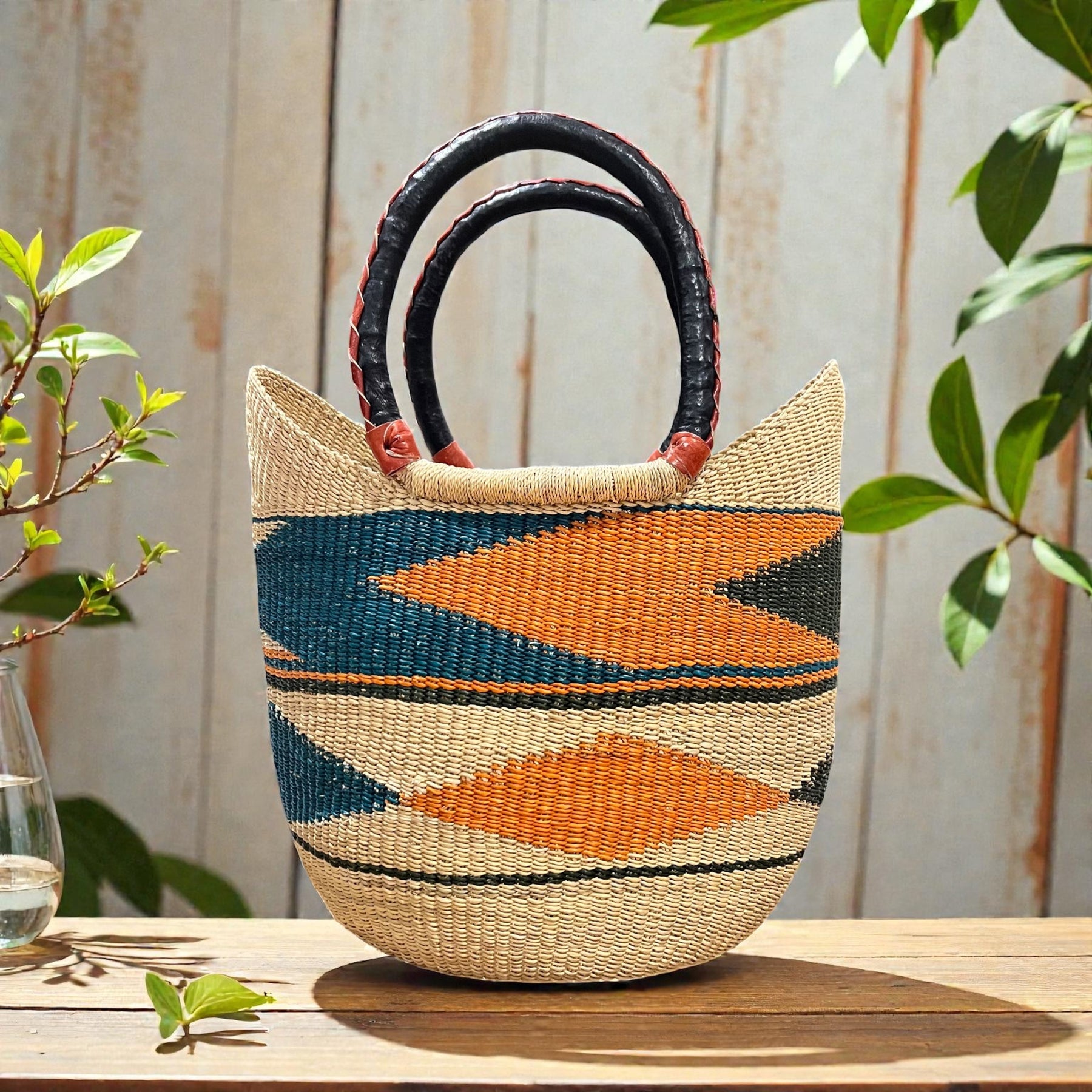 Crafted from veta-vera grass, also known as elephant grass for its remarkable strength, these baskets reflect the rich culture of Northern Ghana. Finished with black leather handles they not just a fashion accessory, they're a symbol of sustainability and tradition.